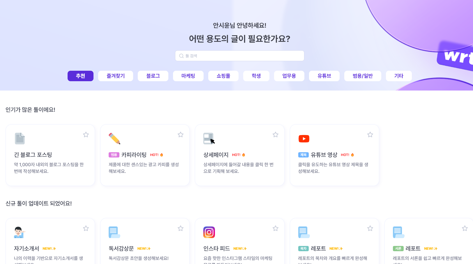 2. 쓰고 싶은 목적의 글 선택 (블로그, 카피라이팅, 상세페이지 등)